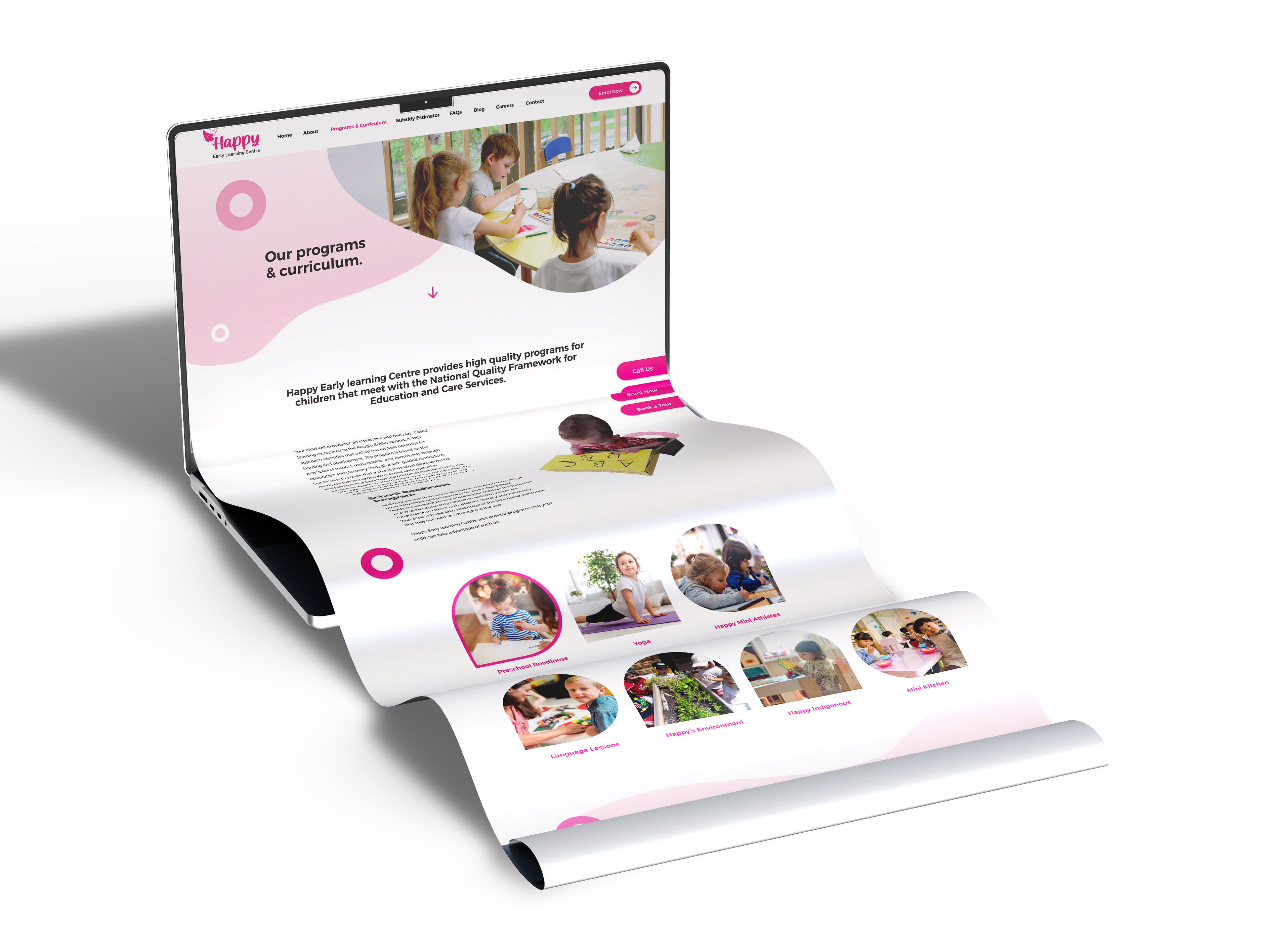 Web Design (UI/UX): Built in Figma and polished with Photoshop, the new website features a fluid, organic UI. It prioritises parent engagement with clear curriculum highlights, streamlined enrollment CTAs, and a soft, wave-based aesthetic that guides the user through the centre’s story.